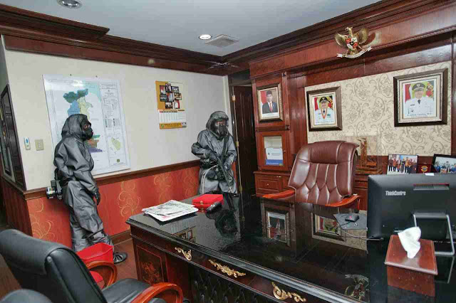 Sejumlah petugas BPBD (Badan Penaanggulangan Bencana Daerah) Medan bersama personil dari Detasemen Gegana Satuan Brimob Polda Sumut melakukan penyemprotan cairan disinfektan ke seluruh ruangan Kantor Wali Kota Medan, Jalan Kapten Maulana Lubis, Kamis (19/3). Hal ini dilakukan sebagai langkah preventif pencegahan penularan Corona Virus Disease 2019 (Covid-19) khususnya di wilayah kantor Sekretariat Kota Medan.Kerjasama BPBD dengan Detasemen Gegana Satuan Brimob Polda Sumut dibawah Komando Pelaksana Harian Kepala Detasemen (Lakhar Kaden) Gegana Sat Brimob Polda Sumut Kompol Henryanto SH MH dinilai sangat membantu Pemko Medan dalam upaya mencegah penularan dan menekan angka penyebaran Covid-19. Apalagi, cairan disinfektan yang mereka memiliki terdiri komposisi bahan yang baik dan cukup efektif.